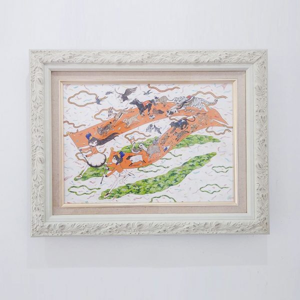 今回の展示では平面作品の他に布に直接描かれたタペストリーにような作品や、
